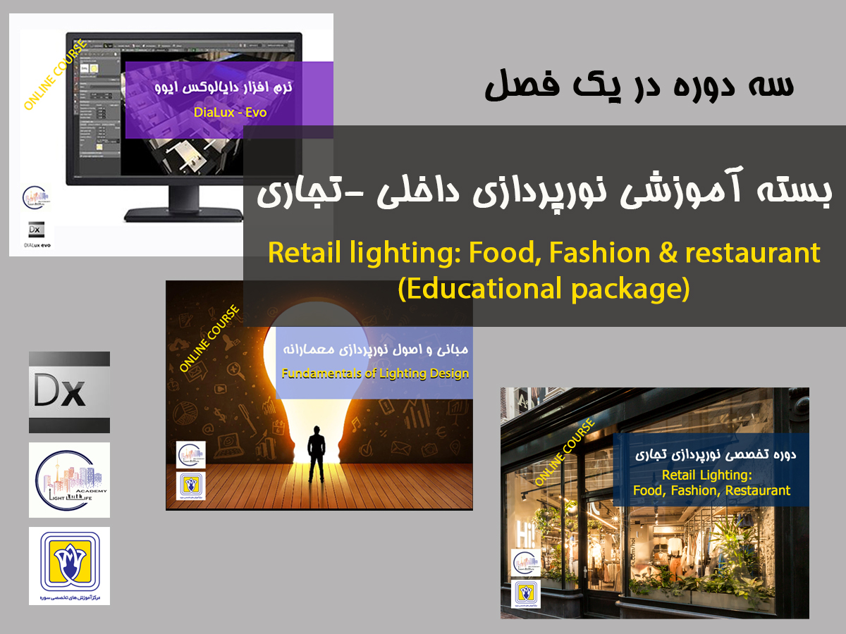 این دوره شامل سه دوره است اگر از نور هیچ نمیدانید در پایان این بسته میتوانید در سطح بین المللی پروژه های نورپردازی تجاری و رستوران را کارکنید. این بسته شامل تخفیف و قابلیت پرداخت 5 ماهه است. دقت داشته باشید با وجود تعداد روزهایی که مشخص شده 4 روز است اما شما عمدتا صرفا دو روز در هفته کلاس دارید. فیلم جلسات به شما داده شده و حضور احباری نیست اما برای مبانی آزمون و برای دوره دایالوکس و تجاری ارائه پروژه ها الزامی است. اگر زمان تمرین دارید این بسته را انتخاب کنید.