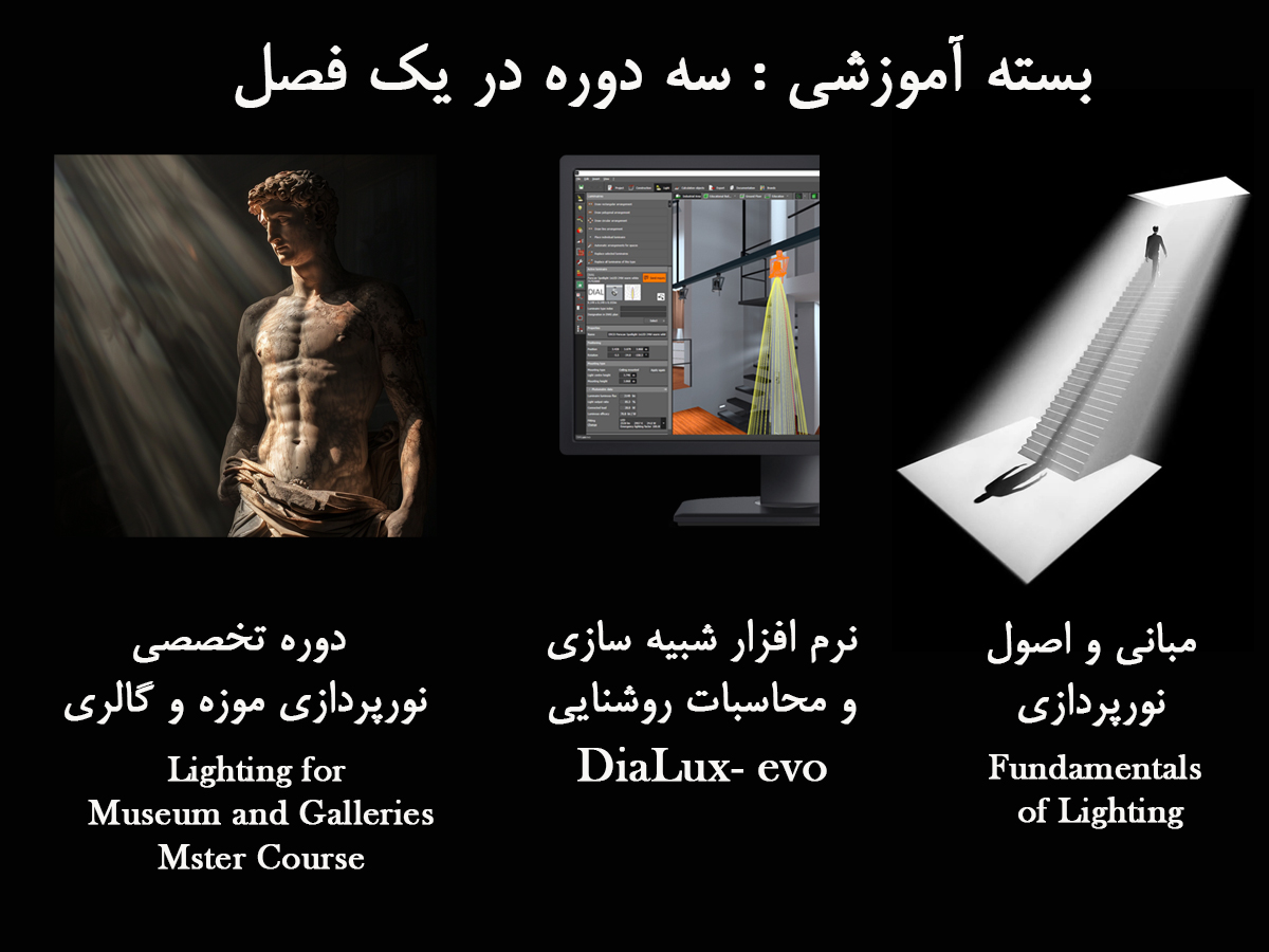 توضیحات تک تک سه دوره مبانی، دایالوکس و نورپردازی تخصصی موزه و گالری را مطالعه بفرمایین.